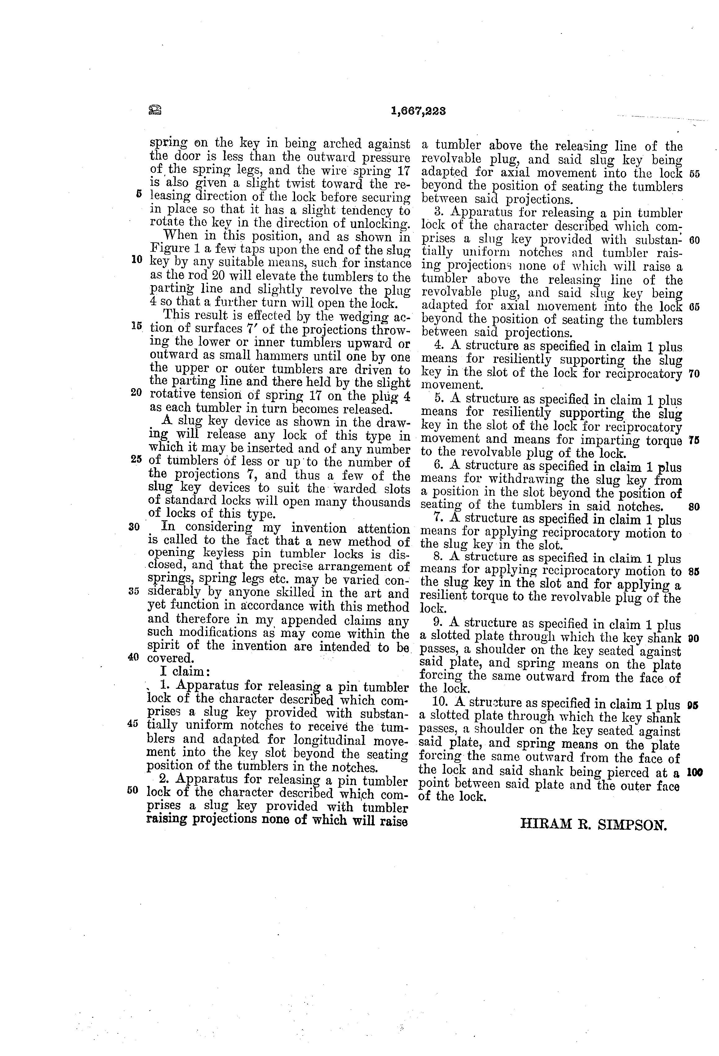Thanks to the U.S. Patent Office, there is proof of the existence of bump keys way back in 1928, although they were not called bump keys at that time. Mr. Hiram R. Simpson filed U.S. Patent #1,667,223 for a lock picking device that operated on the same principle as the bump key. Click on the thumbnails to view the full size images of the patent filing.